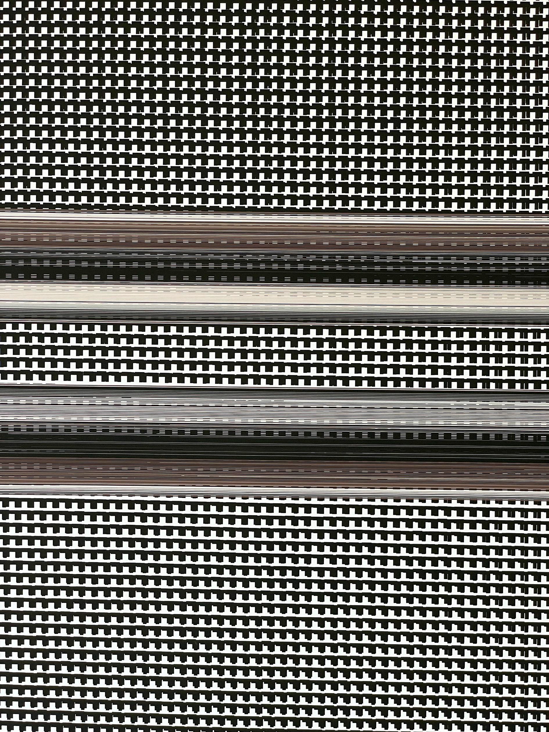 These paintings are composed from tiny identical elements in an array of layers that are very slightly out of phase with each other. Like a musical harmonic or like the Butterfly Effect where very small changes can have large scale effects for shape, volume and space.